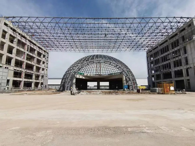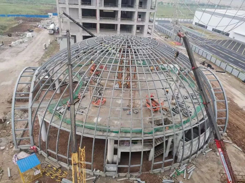 吉利飛行汽車(chē)項(xiàng)目汽車(chē)展廳鋼結(jié)構(gòu)工程,主體是直徑32米的橢圓形空間桁架結(jié)構(gòu),本工程加工工藝復(fù)雜,構(gòu)件數(shù)量多且雜,車(chē)間及現(xiàn)場(chǎng)焊接工作大,主構(gòu)件對(duì)接焊接均要求一級(jí)焊縫,施工期間兩臺(tái)全站儀同時(shí)不同角度測(cè)量,配合臨時(shí)支撐架現(xiàn)場(chǎng)有序、施工,整體工期45天。