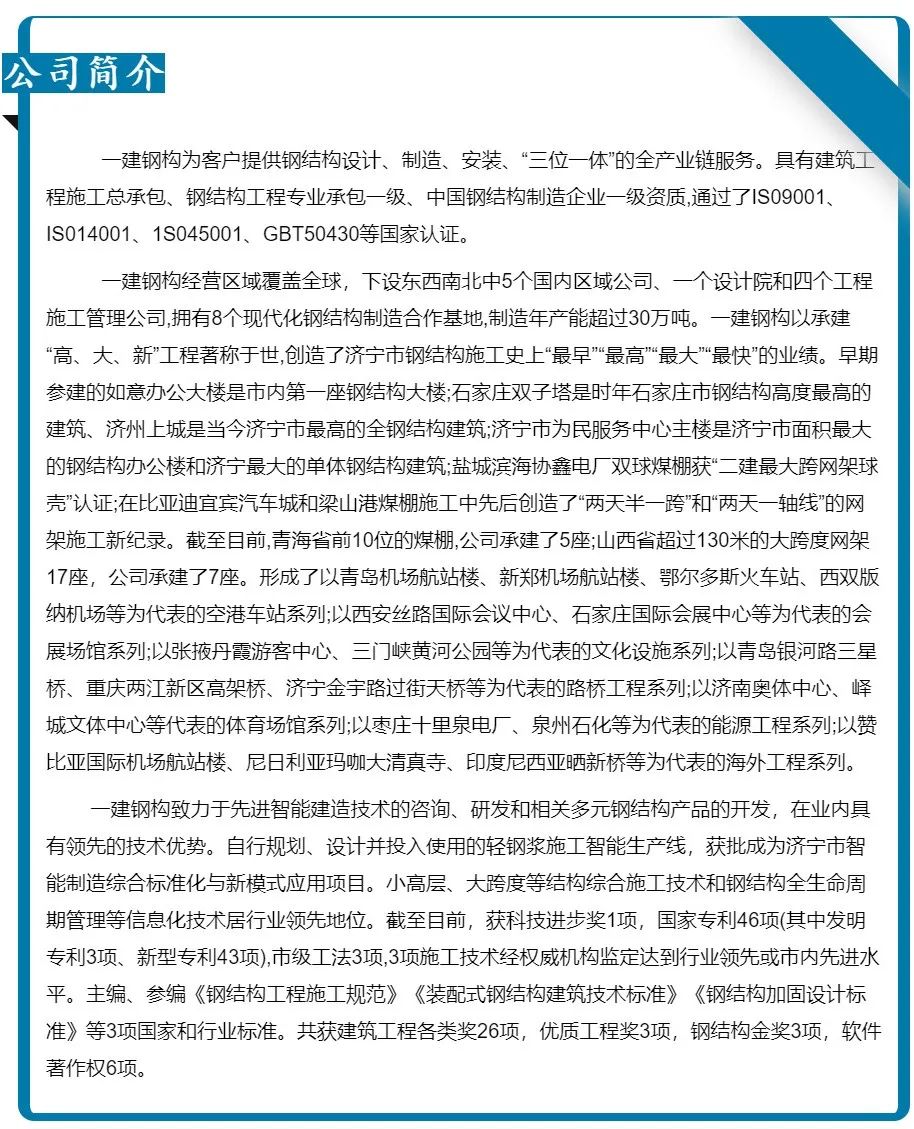 濟(jì)寧一建鋼結(jié)構(gòu)工程有限公司承建的金屬屋面及維護(hù)工程,涉及1#-4#物流倉庫、高架立體庫。倉庫跨度80米,屋面標(biāo)高34.1米,為雙向找坡結(jié)構(gòu)。該項(xiàng)目建設(shè)規(guī)模大、工期緊、技術(shù)精度要求高、工況復(fù)雜,自項(xiàng)目開始施工。公司對(duì)現(xiàn)場(chǎng)管理嚴(yán)格要求,積極配合業(yè)主及總包的整體調(diào)配,施工嚴(yán)格執(zhí)行施工方案,遵循規(guī)范標(biāo)準(zhǔn),合理安排人、機(jī)、料等,戮力同心將馬士基臨港旗艦倉項(xiàng)目打造成精 品工程、優(yōu) 質(zhì)工程。